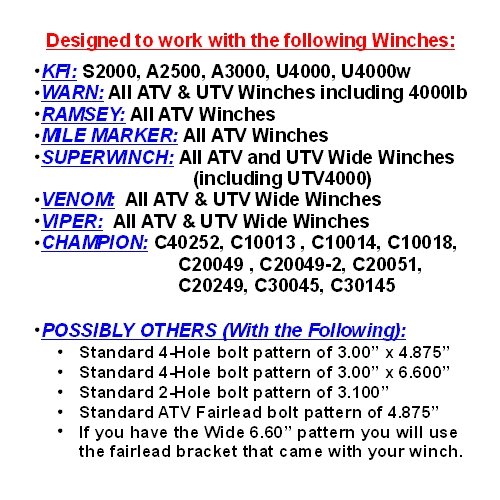 Please click on the images above to see all of the machines and winches that this mount is compatible with. This mount is designed to work with most of the winches with the 2-Hole mounting pattern of 3.100", the 4-Hole mounting pattern of 3.00"x4.875", and the 4-Hole WIDE mounting pattern of 3.00" x 6.60" listed in the above images. It also requires a roller fairlead or hawse with a bolt up pattern of 4.875". If you are mounting a winch with the WIDE 4-Hole pattern you will need to use the fairlead bracket that came with your winch. If you have any questions on whether your winch will work please give our customer sales representatives a call at 1-877-346-2050.